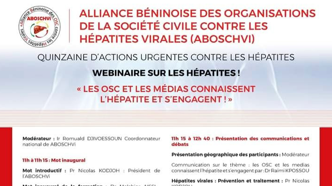 C’est un webinaire de formation sur le thème “Les OSC et les médias connaissent l’hépatite et s’engagent” tenu ce mardi 27 juillet qui a consacré le lancement des activités de l’édition 2021 de cette quinzaine. Plus d’une centaine d’Organisations de la Société Civile, Groupements et Associations de femmes, de jeunes, et professionnels de médias,… ont participé à cette formation dont l’objectif est de renforcer la connaissance des OSC et autres acteurs sur les hépatites pour prendre des initiatives afin de rejoindre la grande famille ABOSCHVi pour le combat vers l’élimination de l’hépatite au Bénin d’ici 2030.